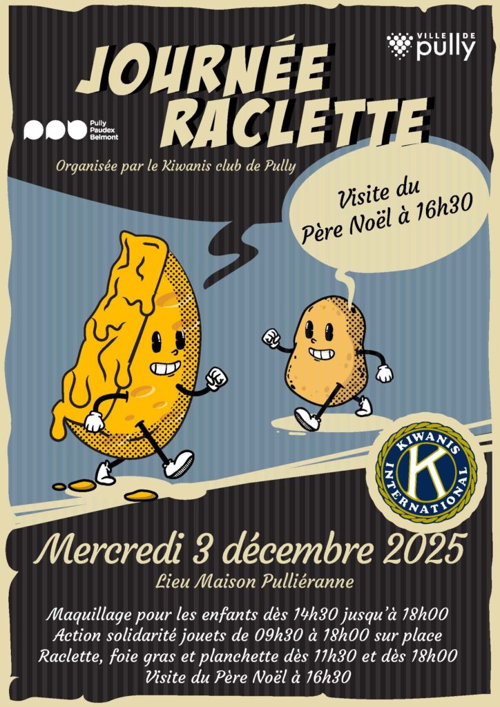 Le mercredi 03 décembre 2025 à 11h30 Le mercredi 3 décembre 2025, avec le soutien de la Ville de Pully, le Kiwanis Club Pully organise sa traditionnelle journée raclette à la Maison Pulliérane, dont u…