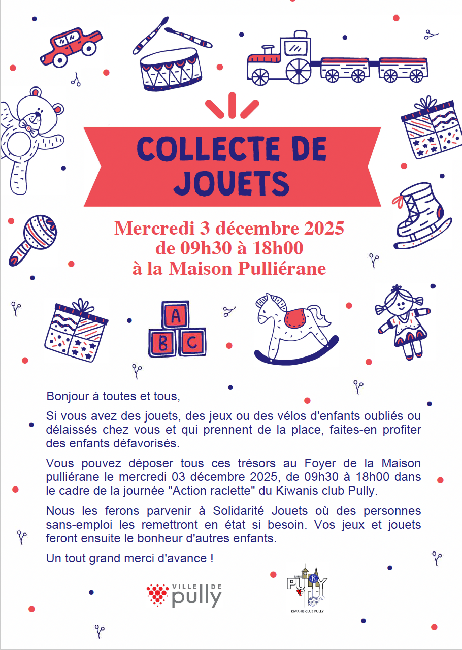 Le mercredi 03 décembre 2025 à 09h30 Dans le cadre de sa journée raclette, le 3 décembre 2025 à la Maison Pulliérane, le Kiwanis club Pully, avec le soutien de la Ville de Pully, organise la collecte …