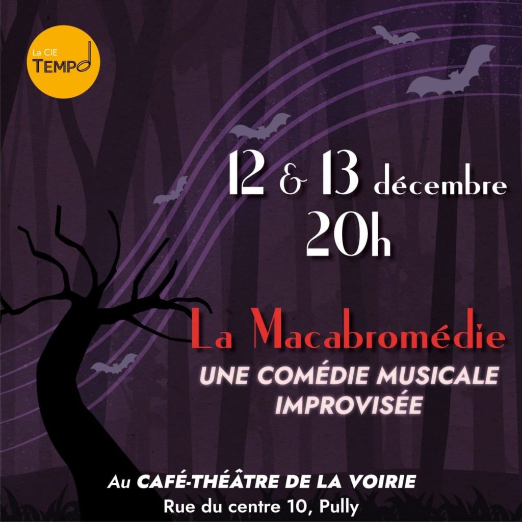 samedi 13 décembre 2025 à 20h00 La Macabromédie (comédie musicale improvisée) par la cie Tempo Au fond des forêts obscures, dans les manoirs oubliés, les ruelles sombres, la terne lumière d’un soleil …